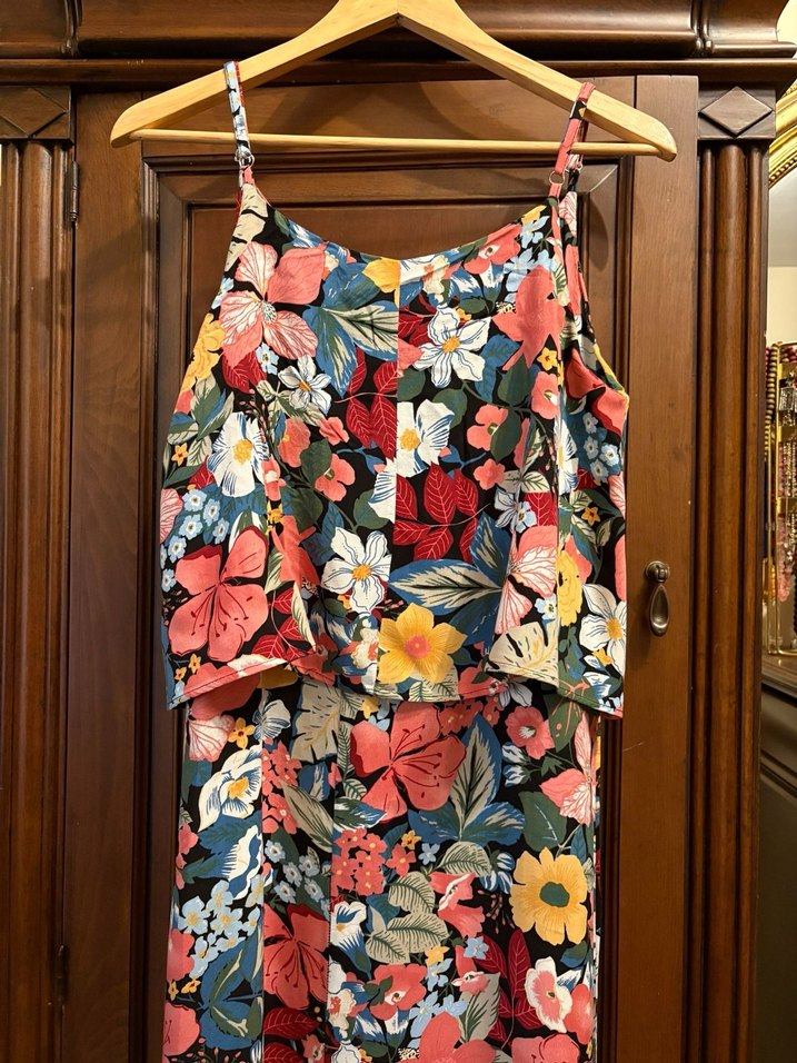 Çiçek desenli uzun elbise, askılı ve yakadan göğüs altına kadar bir parça var. Rahat kesimi ve renkli çiçekli deseni ile çok rahat edersiniz Beden 40 Boy 145 cm Göğüs 100 Basen 120