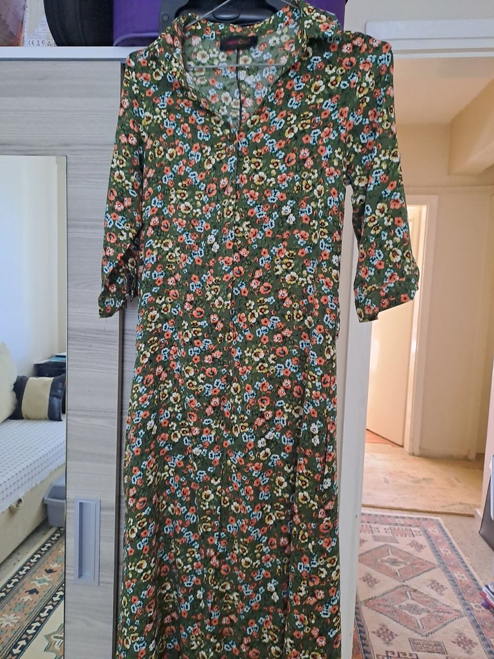 Koyu renkli çok renkli çiçek desenli, yarım kollu, yakalı ,v yaka, düğmeli, belden oturan elbise, viskon kumaştan yapılmıştır. s bedene uygun