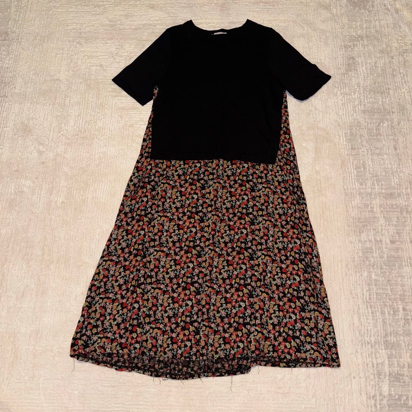 Uzun elbise, koyu renkli çok renkli çiçek desenine sahip, bohem tarzında günlük kullanıma uygun.