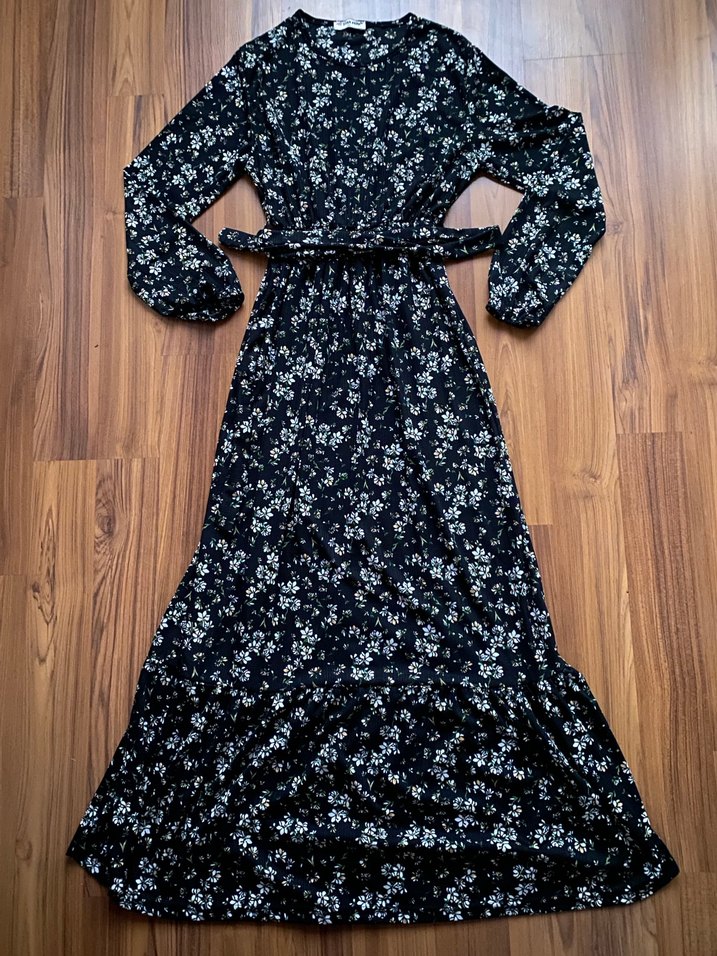 Siyah renkte, belden lastikli, üzeri çiçek desenli, uzun kol, kemerli, etek kısmı fırfırlı uzun elbise. (Ürün sıfırdır etiketi yoktur.)