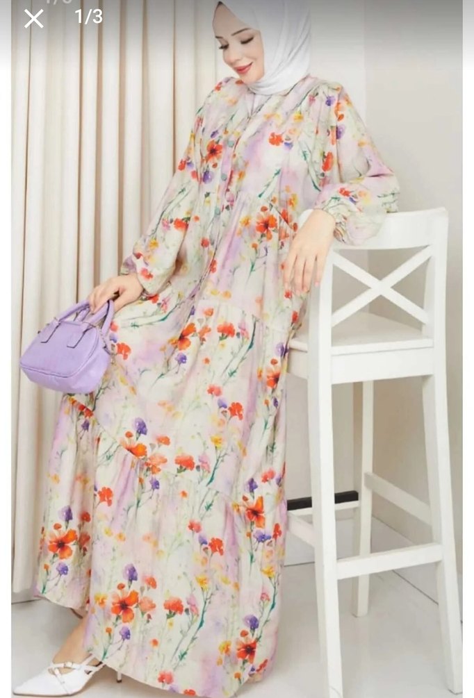 Çiçek desenli, bol kesim uzun elbise. Yüksek yakalı ve uzun kollu, yumuşak sentetik kumaştan günlük kullanıma uygun.