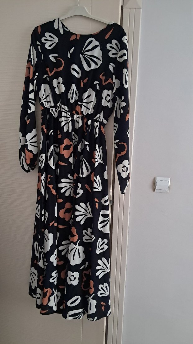 Uzun, bol kesim elbise, koyu renkli çok renkli çiçek desenine sahip. Uzun kollu ve , sentetik kumaştan, drapeli tarzda, bohem tarzını yansıtıyor.