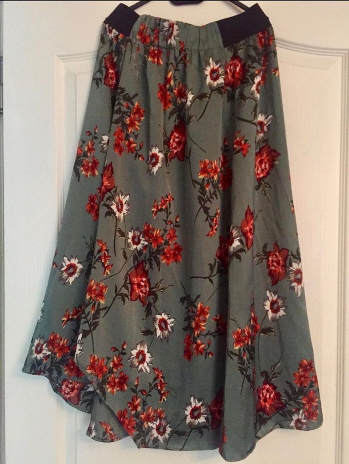 Yeşil renkte, çiçek desenli uzun etek, beli lastikli yandan yırtmaçlı etiketi kesik 38 bedene uygun tril tril kumaş çok şık etek .