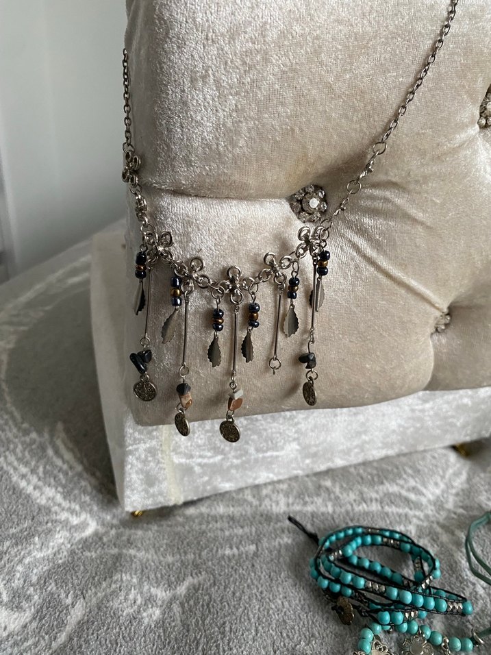 Gri renkte, uzun zincirli, çiçek desenli ve detaylı sallantılı süslemelere sahip bohem kolye, günlük kullanıma uygundur.