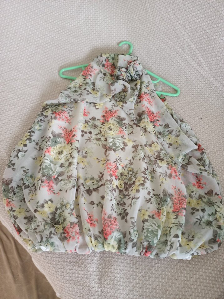 Çiçek desenli, askılı ve drapeli uzun hamile bluzu. Bol kesimli ve yumuşak sentetik kumaştan, açık pastel tonlarda, dış mekan kullanımı için uygun.
