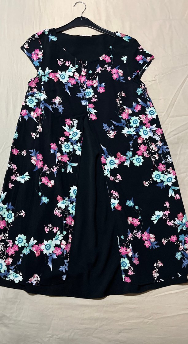 Koyu renkli, çok renkli çiçek desenli hamile elbisesi, V yaka, kısa kollu ve bol kesimdir. Sentetik kumaştan, günlük kullanım için drapeli tasarıma sahiptir.