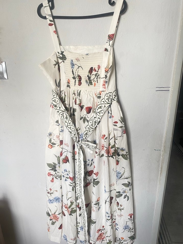Çiçek desenli, askısız, uzun hamile elbisesi. Bol kesim ve drapeli tasarımıyla bohem tarzı yansıtır. Hafif beyaz kumaştan yapılmıştır.