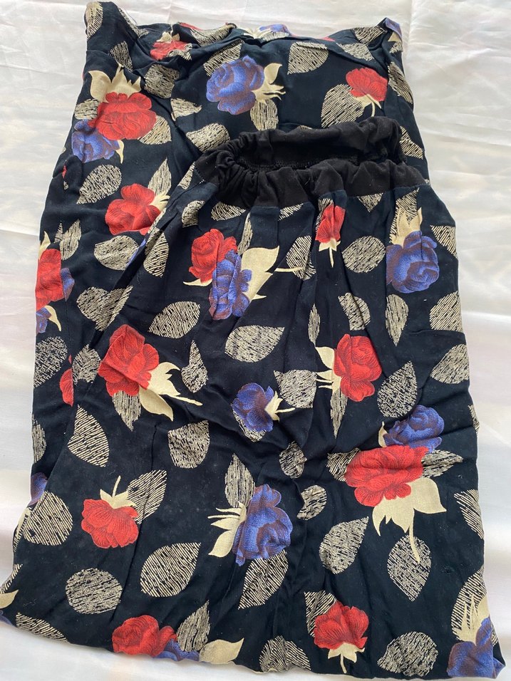 Koyu renkli sentetik kumaş üzerinde canlı çiçek desenleriyle, bol kesim ve drapeli uzun hamile eteği, bohem tarz sunar.