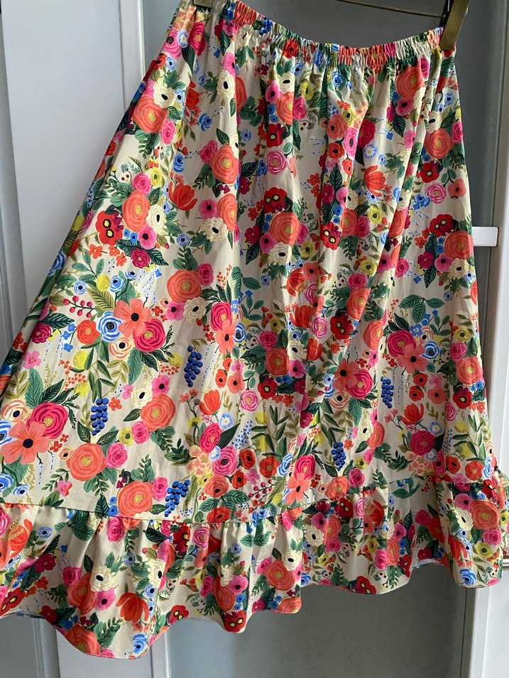 Renkli çiçek desenli, bol kesim uzun hamile eteği, volan detaylı, bohem tarzına uygun. Ölçüleri boy 73 cm beli lastikli 38 cm