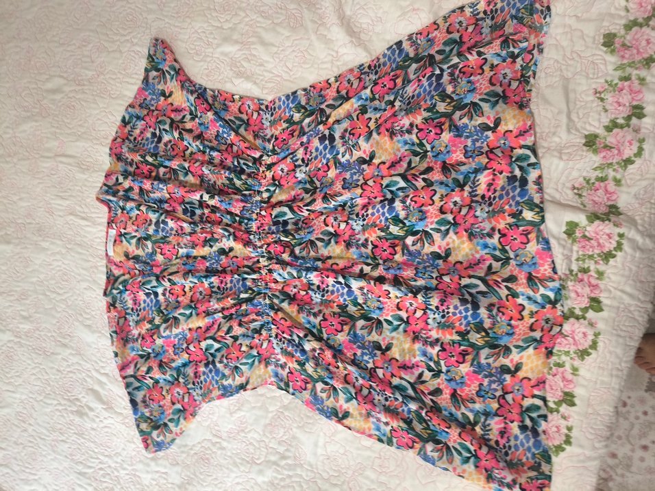 Renkli çiçek desenli hamile tunik, kayık yaka, askılı kollar ve fırfır detaylarıyla dikkat çeker. Bol kesim ve uzun boy outdoor kullanıma uygundur.