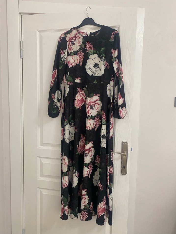 Çiçek desenli, uzun ve bol kesim kadın elbisesi. Uzun kollu, yuvarlak yakalı, yumuşak sentetik kumaştan, günlük kullanım için uygun.
