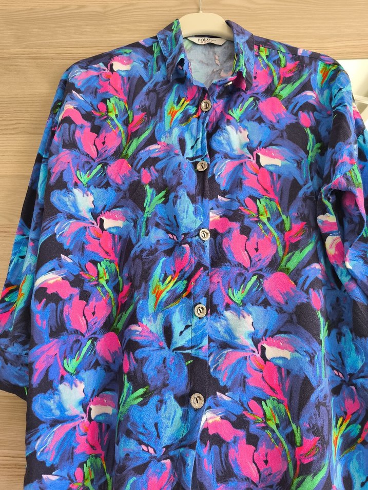 Çiçek desenli, yakalı ve düğmeli uzun kadın gömleği. Rahat kesim, kısa kollu, yumuşak tekstil kumaştan, bohem tarzı için uygun.