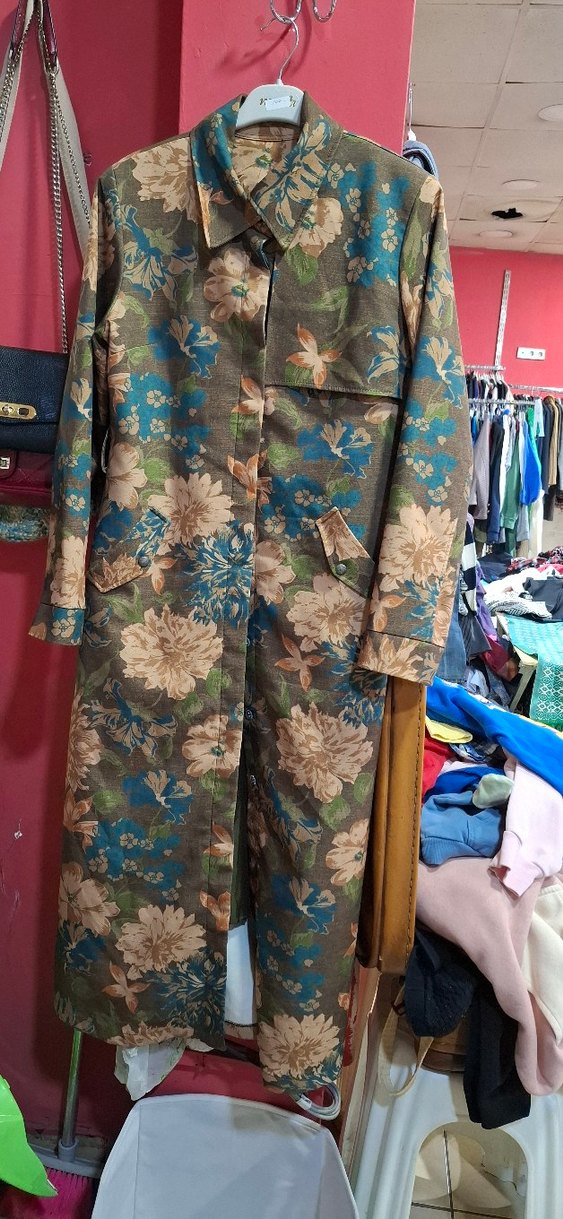 Çiçek desenli, düğmeli ve uzun kollu kadın kaban. Geniş kesim, yaka detaylı, günlük kullanıma uygun rahat bir tekstil kumaşından yapılmıştır. s beden desenli çok şık