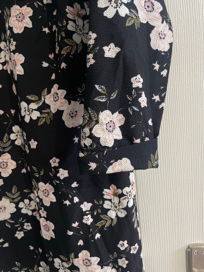 Çiçek desenli, koyu renk sentetik kumaştan uzun, düğmeli kadın kimono. Salaş kesim, uzun kollu ve yakası açık, bohem tarzı yansıtıyor.