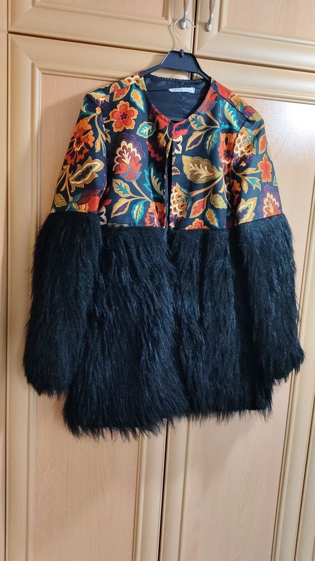 Çiçek desenli üst kısmı ve koyu renk suni kürk alt ve kollarıyla uzun kadın mont. Salaş kesim ve yaka detaylı, bohem stil için uygun.