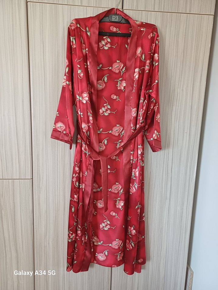 Renkli çiçek desenli, uzun ve bol kesim, askılı kollu vintage bohem tarzında kadın sabahlık gecelik ,saten kumaş 5 parça