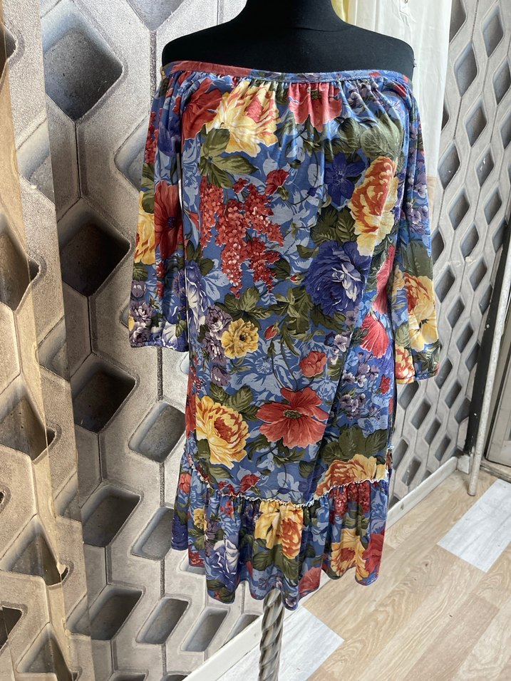 Çok renkli çiçek desenli, uzun ve bol kesim, kayık yakalı, uzun kollu, dökümlü bohem tarzda elbise.