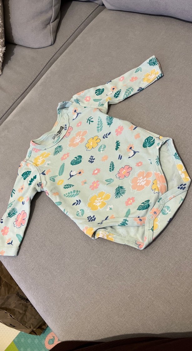 Pastel renklerde, uzun kollu ve yuvarlak yakalı bebek body. Çok renkli çiçek desenli