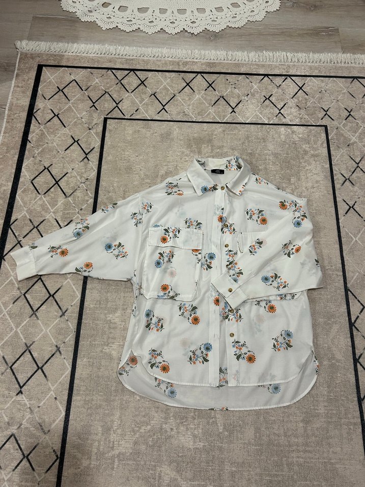 Beyaz gömlek, yakalı, düğmeli uzun kollu ve bol kesimdir. Yumuşak sentetik kumaş üzerine çiçek desenlidir, rahat günlük kullanım için uygundur. Uzunluğu 72 cm koltuk arası uzunluğu 55 cm