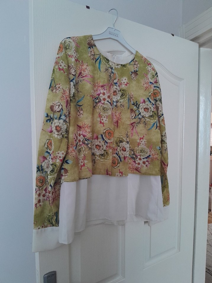 Çiçek desenli, uzun kollu, düğmeli ve kısa kesim bol hamile bluzu. Beyaz ve açık renk tonlarında, bohem tarzda rahat bir modeldir.