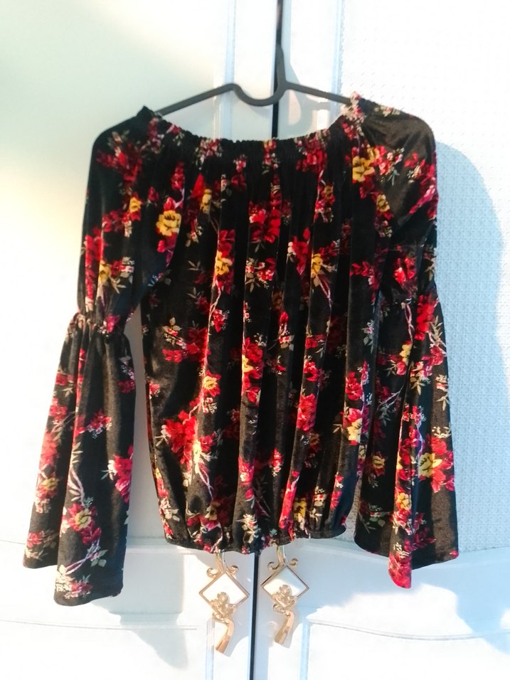 Bohem tarzı, uzun kollu, straplez yakalı ve bol kesim bluz. Koyu renkli çok renkli çiçek desenli, pliseli sentetik kumaştan yapılmıştır.