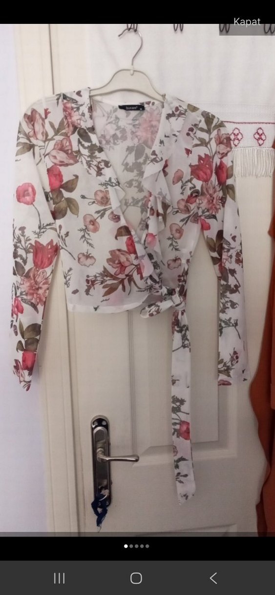 Çiçek desenli, beyaz renkte, uzun kollu ve V yakalı, drapeli ve midi boyda bohem tarzda dar kesim bluz.