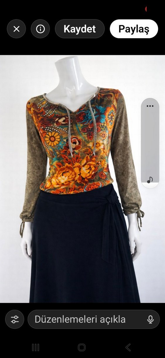 Bu bohem bluz, uzun kollu ve bol kesim olup, çok renkli çiçek deseni, drapeli tekstil kumaş ve yuvarlak yakaya sahiptir. Günlük kullanıma uygundur.