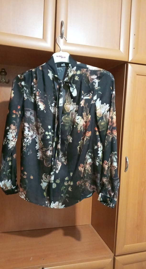 Sentetik kumaştan, çiçek desenli, bohem tarzda, düğmeli ve halter yakalı, bol kesim uzun kollu bluz. Ofis kullanımı için uygun.