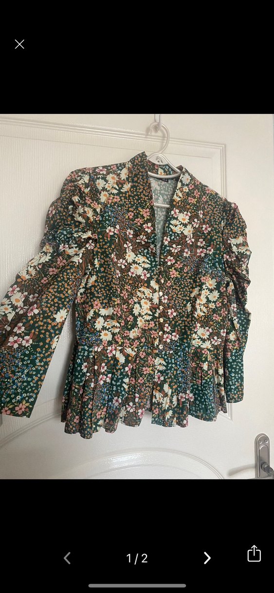 Bu dar kesim bohem bluz, uzun kollu ve yaka detaylıdır. Düğmeli önü ve koyu renkli çok renkli çiçek deseniyle yumuşak tekstil kumaştan üretilmiştir. Günlük kullanım için uygundur.