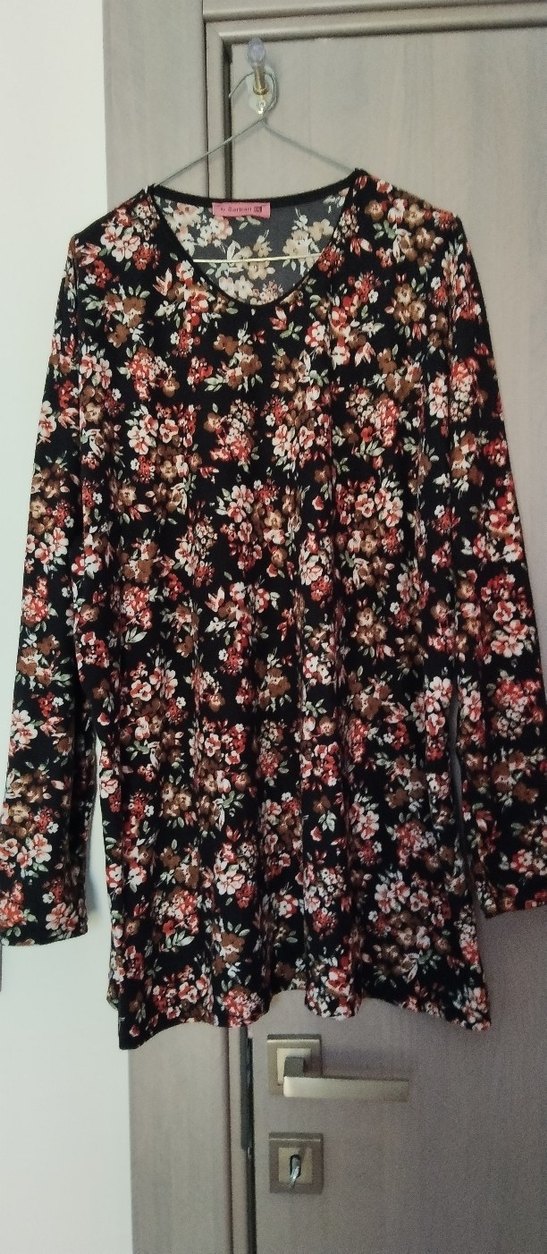 Kadınlar için uzun kollu, bol kesim, düğmeli V yaka bluz. Koyu renkli çok renkli çiçek desenli, rahat bohem tarzda.