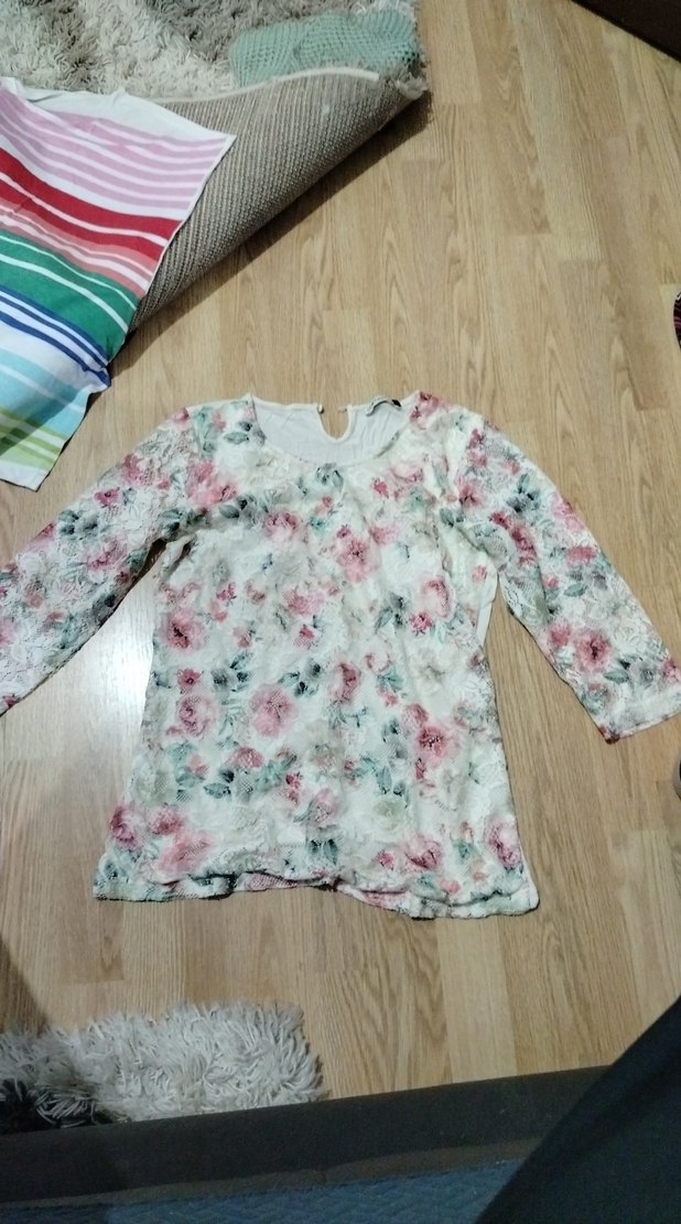 Yumuşak sentetik kumaştan, çiçek desenli dantel detaylı, uzun kollu, bol kesim ve yuvarlak yakalı bohem bluz.