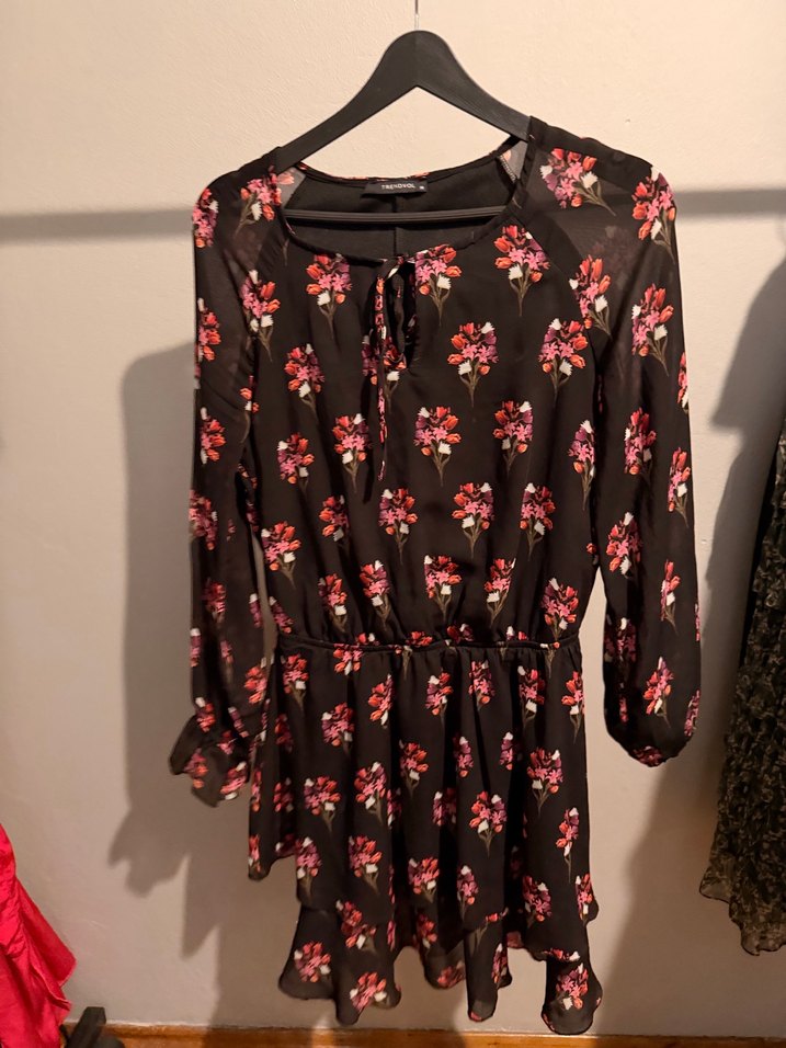 Bu bol kesim bohem elbise, uzun kollu ve V yakalıdır. Koyu renkli sentetik kumaş üzerinde çiçek desenleri ve fırfır detayları bulunur. Midi boyda, romantik akşamlar için uygun.