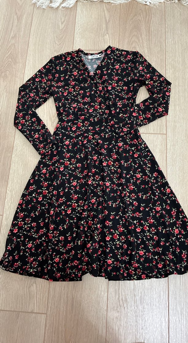 Yumuşak sentetik esnek yakası kruvaze ve koyu renk çok renkli çiçek desenli, uzun kollu ve vücuda oturan bohem elbise. beden38. bel 33. boy 92