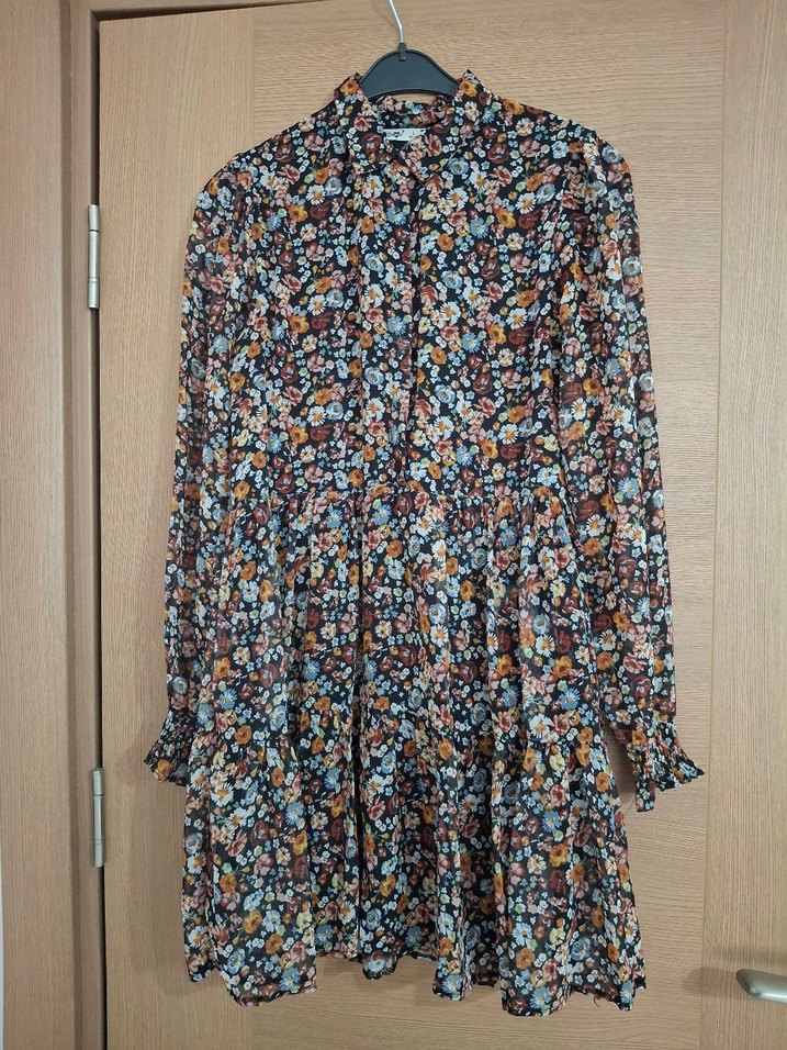 Bohem tarzda, uzun kollu ve yüksek yakalı, bol kesim elbise. şifon kumaştan, koyu renkli çoklu çiçek desenli ve fırfır detaylı elbise Günlük kullanıma uygun.