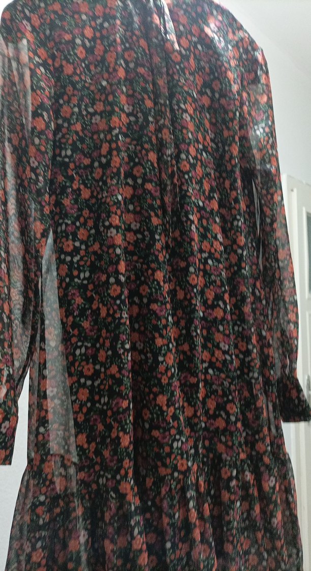 Yüksek yakalı, uzun kollu ve gevşek kesim olan bu uzun elbise, yumuşak sentetik kumaştan yapılmıştır. Koyu renkli çok renkli çiçek desenleri ve fırfır detayları ile bohem tarzını yansıtır.