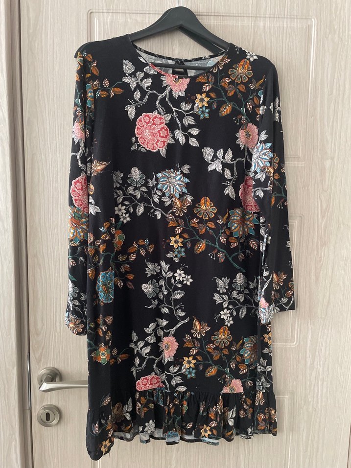 Uzun kollu, bisiklet yaka, bol kesim midi elbise. Sentetik kumaştan, koyu renkli çok renkli çiçek desenli ve volan detaylı.