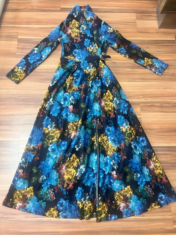 Fitted kesim, uzun kollu, çiçek desenli koyu renkli bohem elbise, drapeli ve yakası notched lapel, parti için uygun . Az kullanılmış önü açık yandan kemerli kadife kumaş marka temsilidir