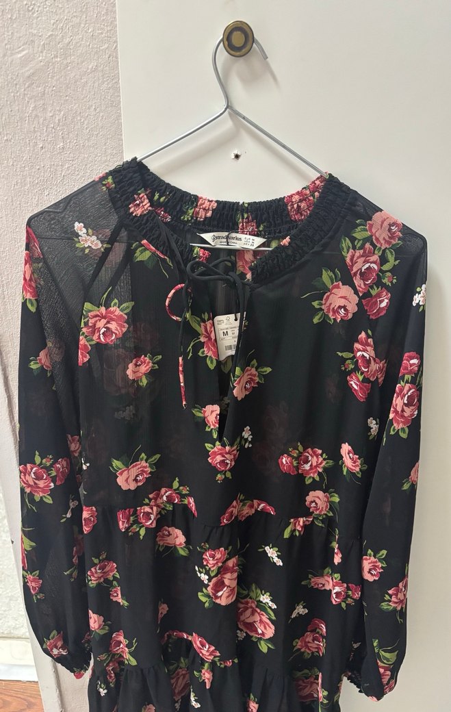 Uzun kollu, V yaka ve fırfır detaylı bohem elbise. Sentetik kumaş üzerine koyu çiçek desenli, rahat kesim. Stradivarius M beden hiç giyilmedi