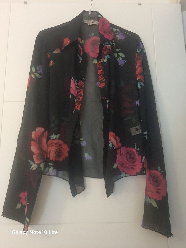çok renkli, çiçek desenli, bol kesim, uzun kollu, yakası açık, düğmeli ve yumuşak şifon kumaştan yapılmış kadın gömleği.