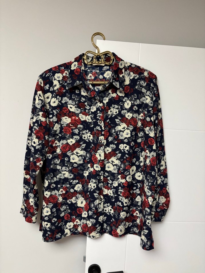 Düğmeli, uzun kollu ve yakalı gömlek. Gevşek kesimli, koyu renkli çok renkli çiçek desenli, günlük kullanıma uygun bohem tarzda.