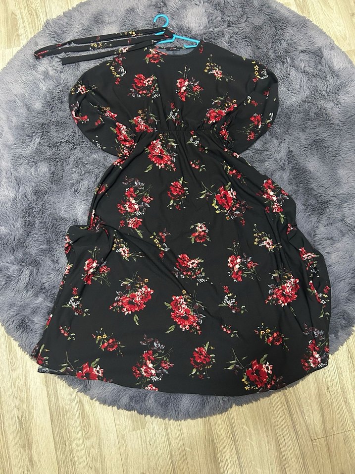 Koyu renkli çiçek desenli, , bol kesim uzun kadın elbisesi. Rahat ve bohem tarzda.