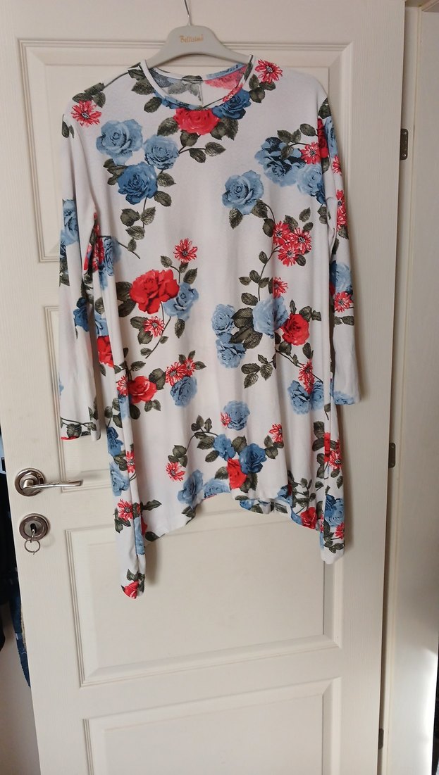 Bohem tarzda, uzun kollu ve kayık yaka bu tunik, çiçek desenleriyle süslenmiş hafif beyaz kumaştan. Salaş kesim ve midi boyda, günlük kullanım için uygundur.