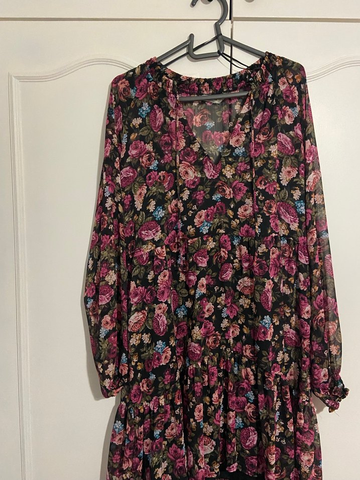 Çiçek desenli, uzun kollu, bol kesim bohem tunik. V yaka ve fırfır detaylarıyla, koyu çok renkli yumuşak sentetik kumaştan üretilmiştir.