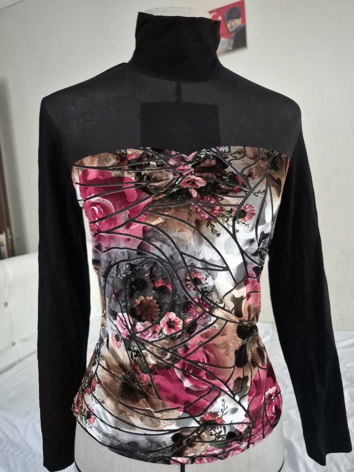 Uzun kollu, üst transparan ve drapeli bu bluz, koyu renkli sentetik kumaş üzerinde canlı çiçek deseni ile avant-garde stilini yansıtıyor. S_M_L bedene olur