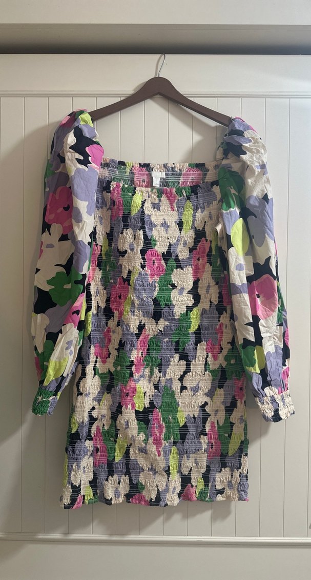 Uzun kollu, straplez yaka ve bol kesimli kadın elbise . çok renkli batik çiçek deseniyle mini boyda drapeli lastikli çok esnek bir yapısı var xl ve sonrası 50 bedene kadar olur