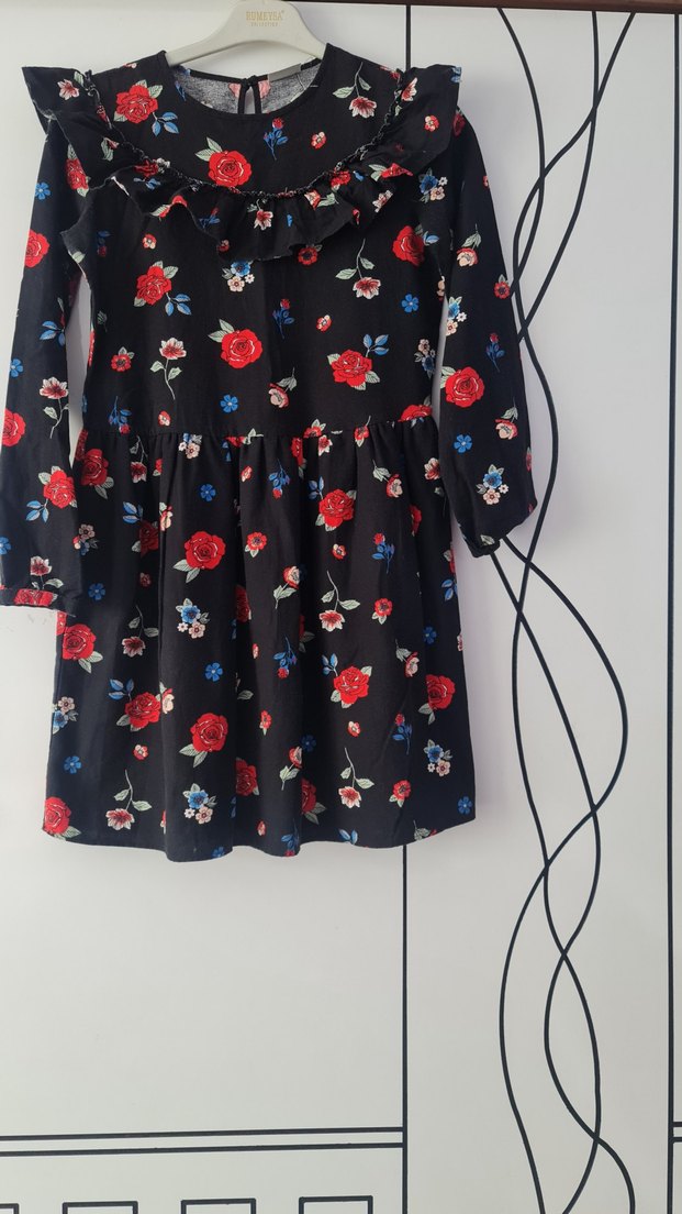 Uzun kollu, kayık yaka ve bol kesim kız elbisesi. Koyu renkli çiçek deseni ve fırfır detayları bulunur, yumuşak sentetik kumaştan üretilmiştir.