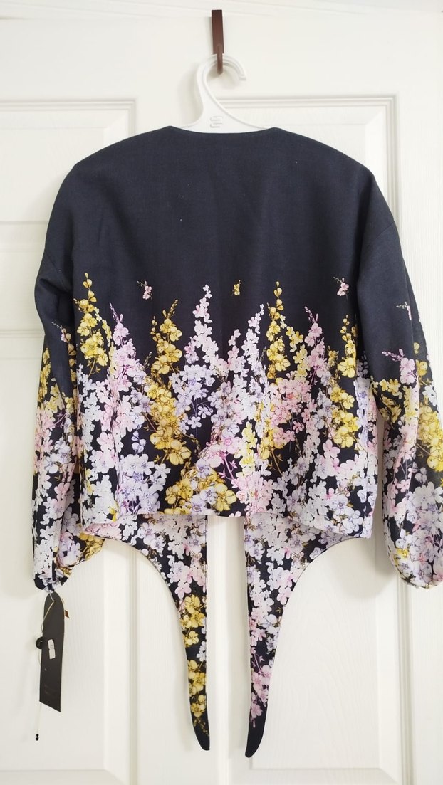 Kadınlar için uzun kollu, salaş kesim, drapeli gömlek Koyu renk zemin üzerine çok renkli çiçek desenleriyle midi boyda, Paris sokak modasına uygun.