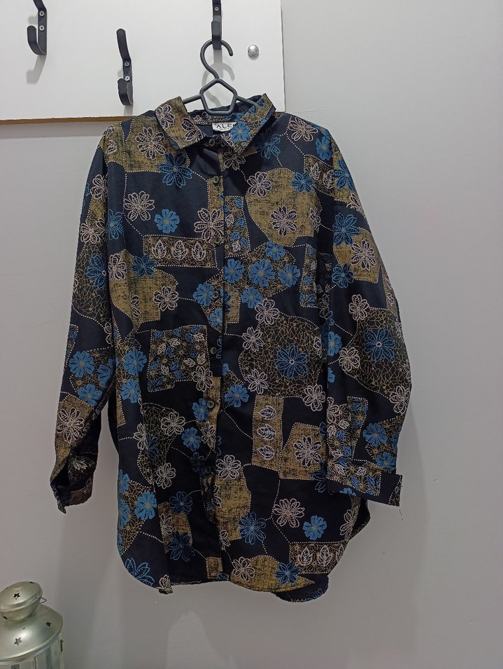 Çiçek desenli, düğmeli ön cep ve uzun kollu, bol kesim gömlek. Günlük kullanıma uygun, koyu renkli çok renkli tasarım. Aler 36/38 Bol Kesim Desenli Gömlek Sadece 1 kez giyildi, kusursuz durumdadır. Siyah zemin üzerine patchwork tarzı mavi, bej ve pembe çiçek desenli, uzun, bol kesim (oversize) tunik gömlek. Jeanlerle ve taytlarla şık kombinler için ideal!