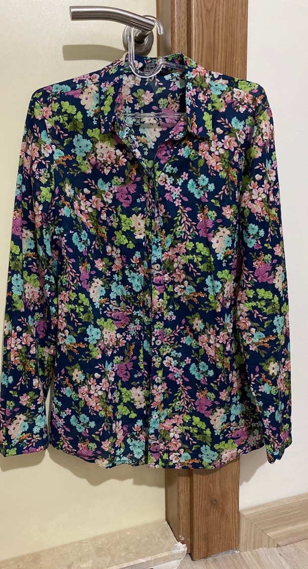 Düğmeli, uzun kollu, yakalı ve bol kesim gömlek.Lacivertin üstüne çiçek desenlidir