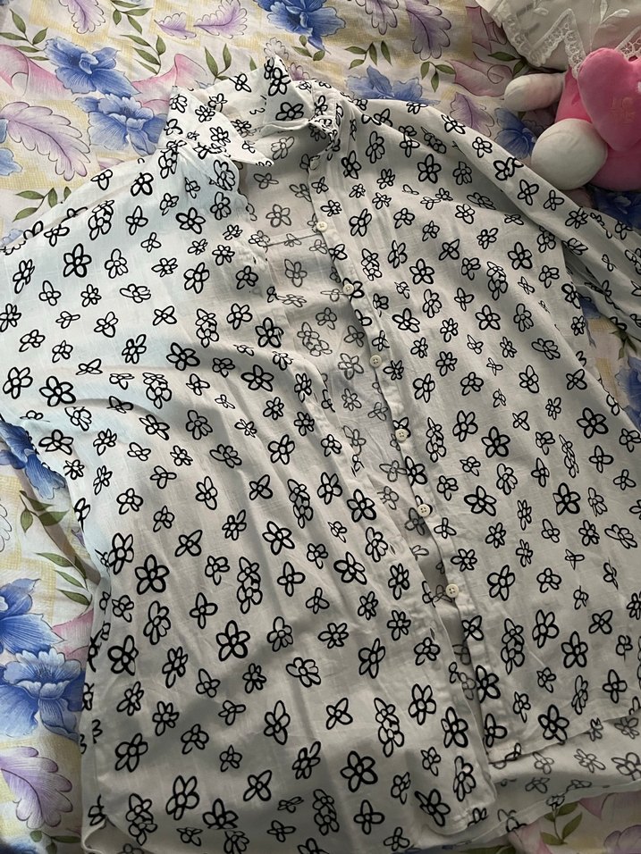 Beyaz gömlek, yakalı ve düğmeli, uzun kollu, bol kesimdir. Gri çiçek desenleriyle süslenmiş, sentetik kumaştan yapılmıştır.